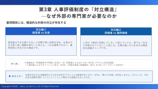 本資料ではさらに、人事評価制度の本質として構造的な対立が存在することを解説しています。