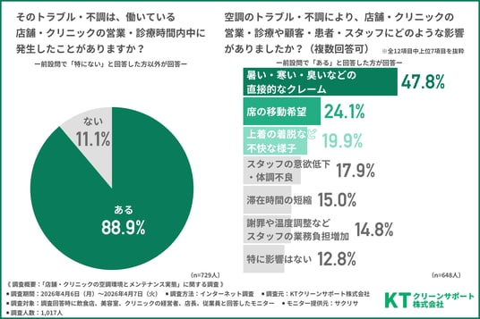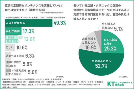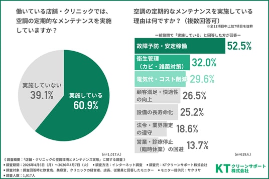 そこで今回、KTクリーンサポート株式会社(https://www.kt-clean-inc.co.jp/)は、飲食店、美容室、クリニックの経営者、店長、従業員を対象に「店舗・クリニックの空調環境とメンテナンス実態」に関する調査を行いました。