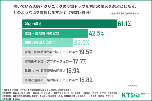 「働いている店舗・クリニックの空調トラブル対応の業者を選ぶとしたら、どのような点を重視するか」と尋ねたところ、『対応の早さ(61.1%)』と回答した方が最も多く、『修理・交換費用の安さ(42.5%)』『修理の技術力の高さ(32.9%)』となりました。
