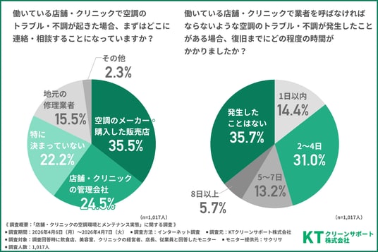 KTクリーンサポート株式会社(所在地:東京都千代田区、代表者:若生 昂之)は、飲食店、美容室、クリニックの経営者、店長、従業員を対象に「店舗・クリニックの空調環境とメンテナンス実態」に関する調査を行いました。