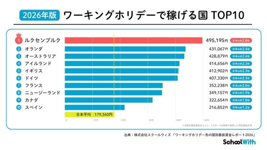 日本最大級の留学メディア/留学エージェント「スクールウィズ」を運営する株式会社スクールウィズ(本社:東京都渋谷区恵比寿、代表取締役:太田英基、以下「スクールウィズ」)は、このたび「ワーキングホリデー先の国別最低賃金レポート2026」を公開しました。