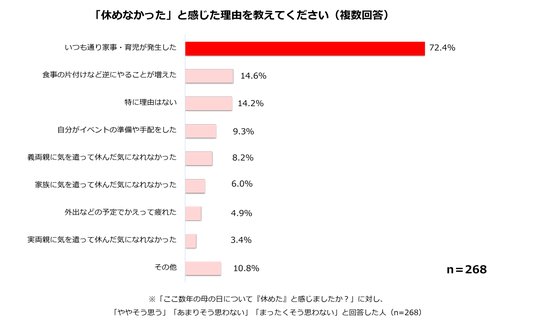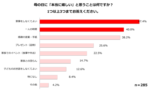 その結果、母の日は「感謝を伝える・伝えられる良い機会」と約半数が回答する一方で、実際には86%が「十分に休めなかった」と回答しました。また、「母の日に本当に嬉しいこと」としては、「家事をしなくてよいこと」「一人で過ごせる時間」など、休息や自分の時間に関する項目が上位となりました。