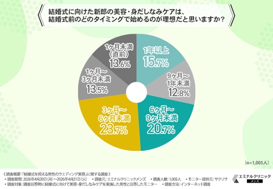 「結婚式に向けた新郎の美容・身だしなみケアは、結婚式前のどのタイミングで始めるのが理想だと思いますか?」と質問したところ、下記のような回答結果となりました。