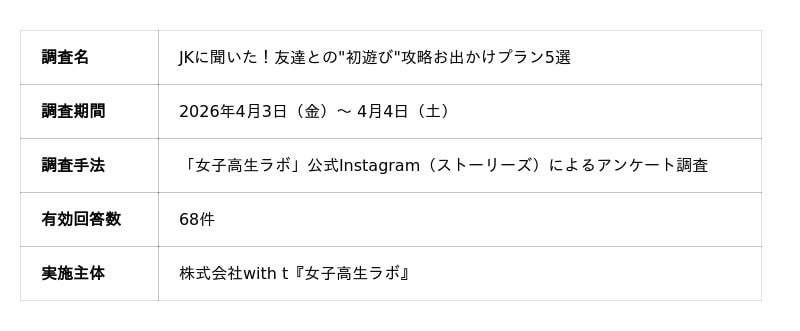 女子高生の「最旬トレンド」を生み出し、ビジネスの「ティップス(ヒント)」を提供するメディア&シンクタンク「女子高生ラボ」(運営:株式会社with t、代表取締役社長:宮城啓太)は、公式Instagramのストーリーズ機能を活用し、全国の女子高生を対象に「友達との初遊びで外せないお出かけプラン」に関するアンケート調査を実施しました。