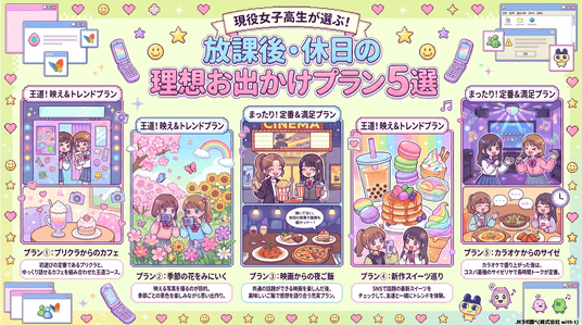 新作スイーツ巡りや食べ歩き、季節の花スポットなど、"写真映え"と"体験"を同時に満たすプランが選ばれています。JKにとっての遊びは「その場の楽しさ」だけでなく「SNSに残せる思い出」であることが重要。単なる消費行動ではなく、コンテンツ化を前提とした行動設計になっています。