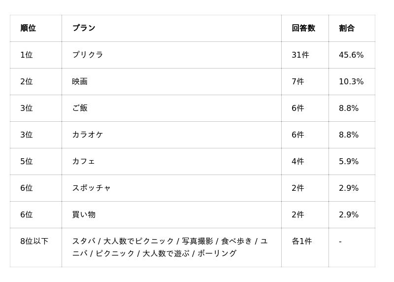 1. 初遊びは「会話+写真」が成立する"軽めプラン"が主流プリクラ(31件)やカフェ(4件)が上位に入り、「写真を撮る」「ゆっくり話す」という2要素を両立できるプランが支持されています。初対面や仲を深める段階では、アクティブすぎない安心感のある行動が選ばれやすい傾向が明らかになりました。