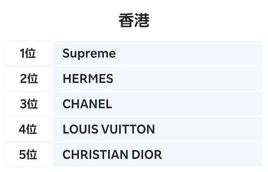 香港では、1位が昨年に引き続き「Supreme」、2位が「HERMES」、3位が「CHANEL」、4位が「LOUIS VUITTON」、5位が「CHRISTIAN DIOR」という結果になりました。「Supreme」ではメンズのTシャツ、次いでキャップやビーニーなどの帽子が人気でした。