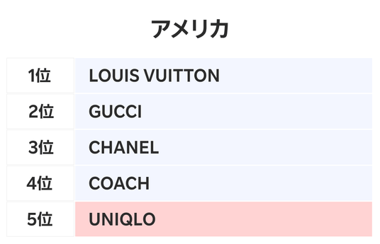 ■アメリカでは3年連続「LOUIS VUITTON」が首位、「COACH」「UNIQLO」が新たにトップ5入り