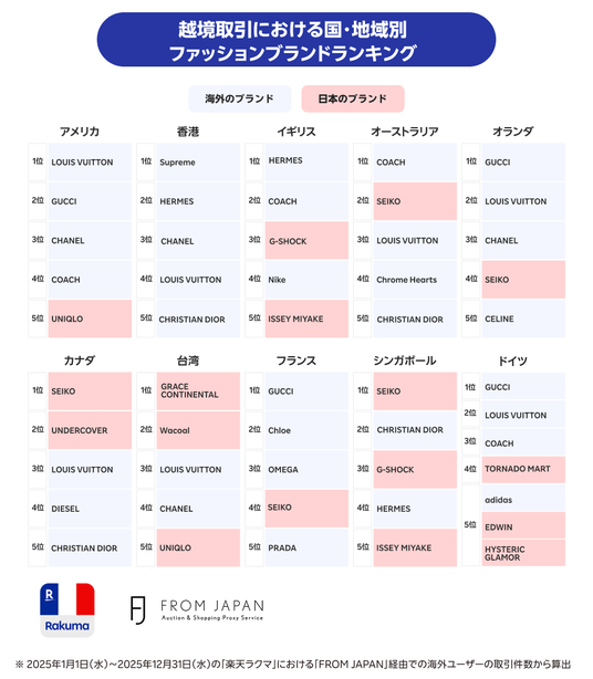 楽天グループ株式会社(以下「楽天」)が運営するフリマアプリ「楽天ラクマ」と、株式会社FROM JAPANが海外在住のユーザー向けに運営する越境ECサイト「FROM JAPAN」は、「楽天ラクマ」における越境取引データを基に、国・地域別で取引数が多いファッションブランドのランキングを発表しました。本調査は2024年から実施し今回が3回目で、「FROM JAPAN」において、2025年の1年間に「楽天ラクマ」を通じて取引されたファッションブランド品の実績に基づき、特に取引数が多い10の国・地域ごとにランキング形式で集計したものです。