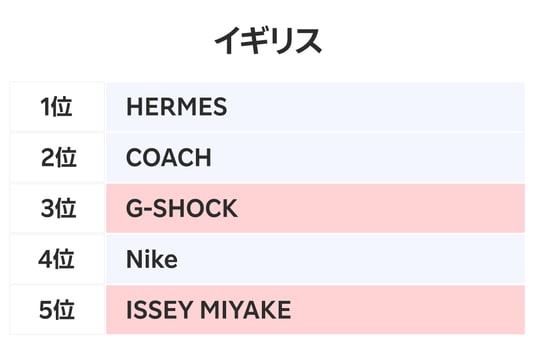 イギリスでは、1位が「HERMES」、2位が「COACH」、3位が日本の時計ブランド「G-SHOCK」、4位が「Nike」、5位が日本のブランド「ISSEY MIYAKE」という結果になりました。1位の「HERMES」で最も多く取引されたのはネクタイでした。また「ISSEY MIYAKE」は3年連続でランクインしており、日本のデザイナーズブランドへの根強い人気が示されています。