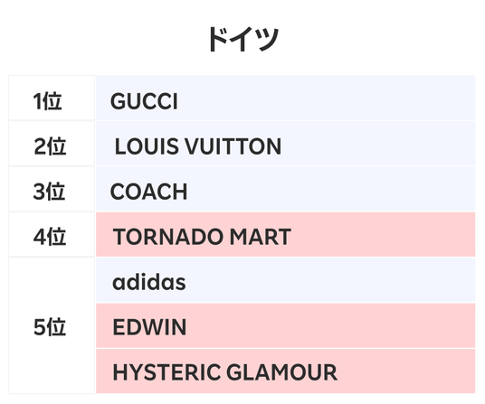 ■ドイツでは「GUCCI」が2年連続首位、日本のブランドからは「TORNADO MART」と「EDWIN」「HYSTERIC GLAMOUR」が新たにランクイン