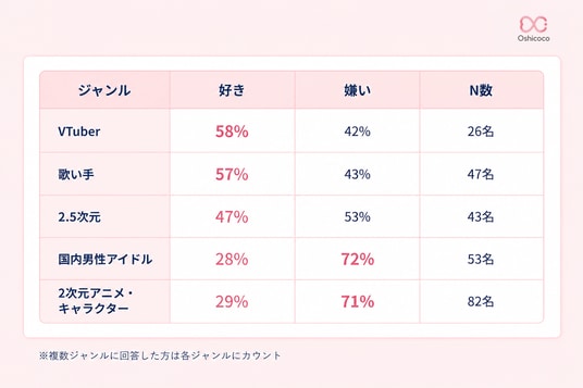 この調査では、VTuber・歌い手推しは「好き」が約6割であるのに対し、国内男性アイドル・2次元推しは「嫌い」が7割超えという対照的な結果となりました。