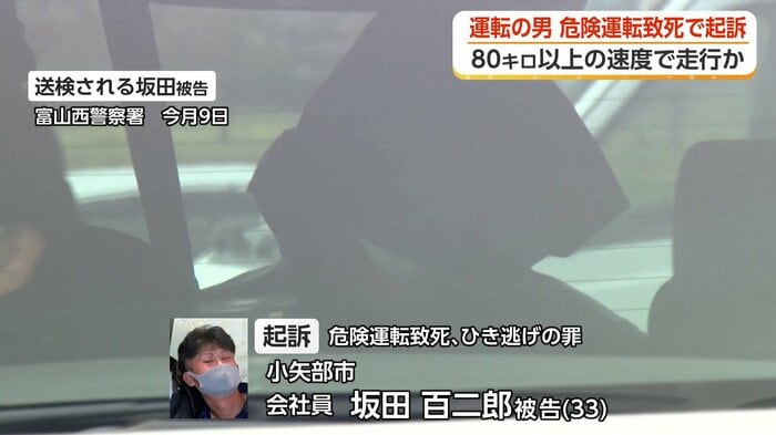 危険運転致死とひき逃げの罪で起訴されたのは、富山県小矢部市の会社員、坂田百二郎被告(33)です。