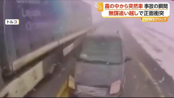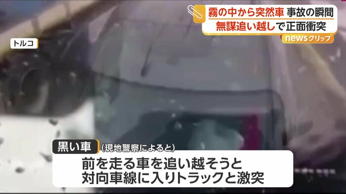 視界がほとんどない中で黒い車が、前を走る車を追い越そうと対向車線に入ったところ、トラックと激突したという。