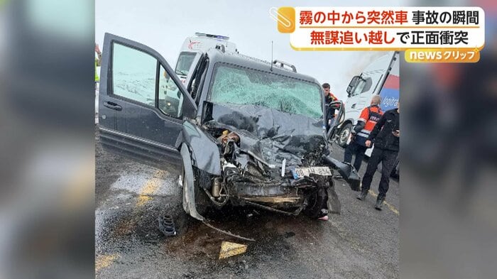 濃い霧が発生する中、片側1車線の道路で車とトラックが正面衝突する事故が起きた。車が追い越しのため対向車線に入ったところ、トラックと衝突したという。車に乗っていた2人は一時閉じ込められたが、救助され命に別条はない。