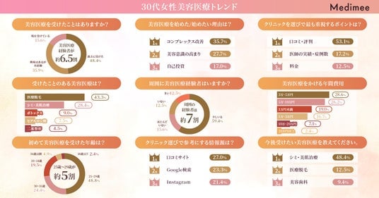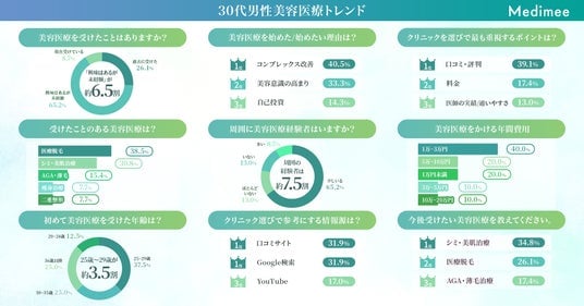 そこで今回Medimeeでは、30代の男女を対象に、美容医療の経験内容や始めた年齢、施術内容、クリニックの選び方、参考にする情報源、費用感について調査を実施しました。30代における美容医療の実態と、その選択プロセスを明らかにします。