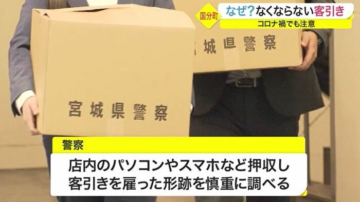 新型コロナウイルスの影響で例年と比べ、客引きの数は減少しているが、10月は523件と去年の7割ほどに回復した。客引きは、法外な値段を請求されるぼったくりの被害に遭う危険がある。さらに、国分町で客引きの取り締まりを行う仙台中央警察署生活安全課の小出秀幸課長は、別の犯罪につながる可能性もあると指摘する。