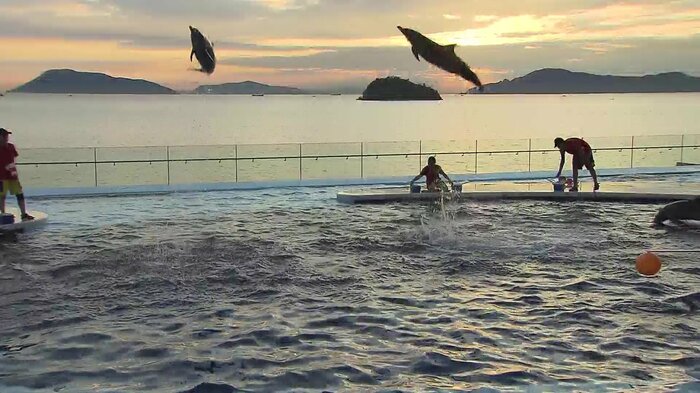 次のこだわりは、「ロケーション」。夕日に照らされた穏やかな瀬戸内海をバックにイルカが泳ぐ。海際にある四国水族館だからこそ楽しめるロマンチックな景色。