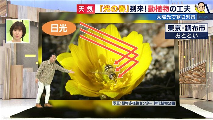 そして、4日に東京・文京区で撮影されたものは、しっかりと花開いていました。このフクジュソウの形が、光をたくさん取り入れるためのポイントになっているのです。