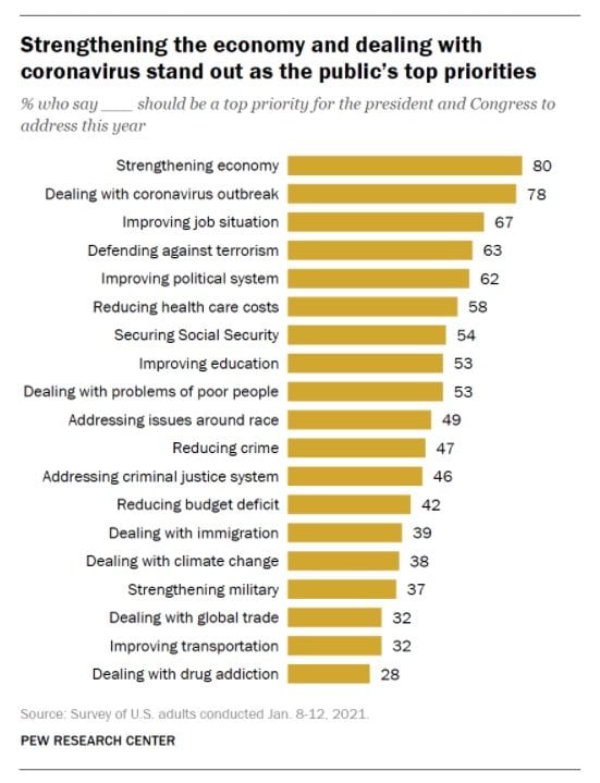 第二に、経済再建に向けた世論の期待の高まりだ。世論の分裂が著しい米国だが、経済再建を重要課題と考える点においては、支持政党による意見の違いは少ない。バイデン政権が提案する追加対策でも、とくに現金給付は支持政党を問わず人気が高い。