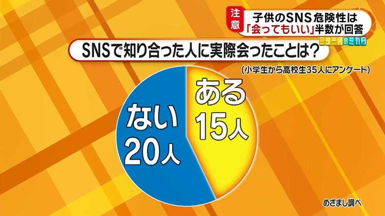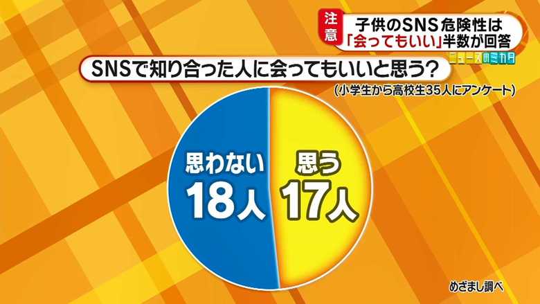「めざましテレビ」が、小学生から高校生に「SNSを使って知らない人に会ってもいいと思うか」と尋ねたところ、35人中ほぼ半数の17人が「会ってもいいと思う」という回答だった。