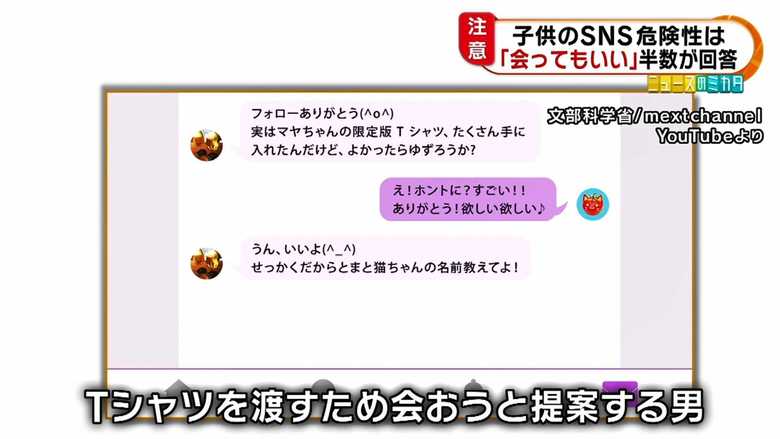 SNSで男が「実はマヤちゃんの限定版Tシャツ、たくさん手に入れたんだけど、よかったらゆずろうか?」と、子どもが興味を持ちそうなものをチラつかせ、会おうと提案してきた。