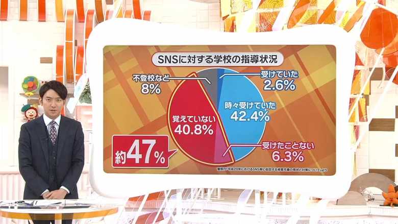 警察庁の調査では、SNSに対する学校の指導状況について「指導を受けたことがない」または「覚えていない」と答えた生徒が、合わせて約47パーセントと半数近くを占める。
