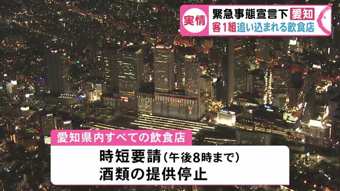 愛知県にも12日から適用された国の「緊急事態宣言」。感染拡大が続く中、県内全ての飲食店に対して時短営業に加えて、お酒の提供を停止するよう求めている。