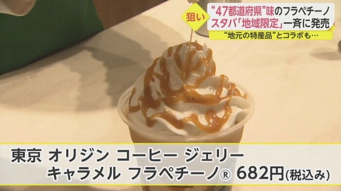 東京都限定は、オリジナルのコーヒーゼリーとキャラメルを合わせた「東京 オリジン コーヒー ジェリー キャラメル フラペチーノ®︎」682円(税込み)。ほろ苦さと甘さが絶妙の一杯となっている。