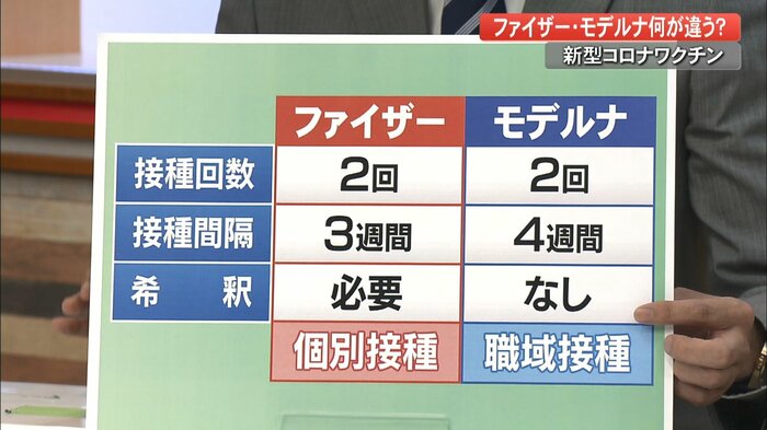 ファイザーは希釈の必要があり、病院での個別接種に使われている。一方、モデルナは、希釈の必要がない。さらに、ファイザーのように超低温冷凍庫も必要ない。