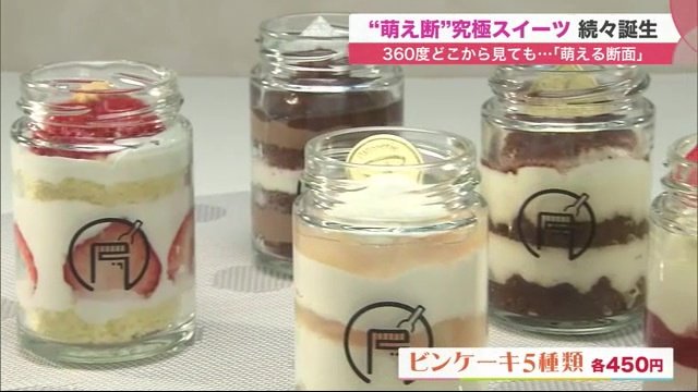 「ビンケーキ」は、旬の果物を使った期間限定のものから、イチゴショートなど全部で5種類。断面をいかにきれいに見せるか、クリームの量やスポンジの位置などを試行錯誤したという。