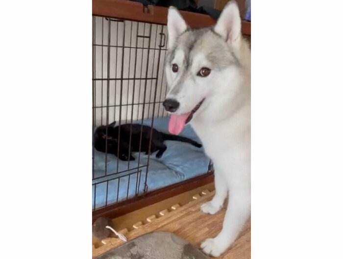 「またハウス占領されてる…」とのコメントと共に投稿された動画には、ハウスで寝そべる猫と、ハウスの外で立ち尽くしているかのように見えるハスキー犬が映っている。