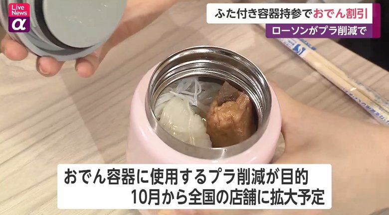 おでんの容器に使われているプラスチックを削減することが目的で、10月から全国の店舗に拡大する予定だ。