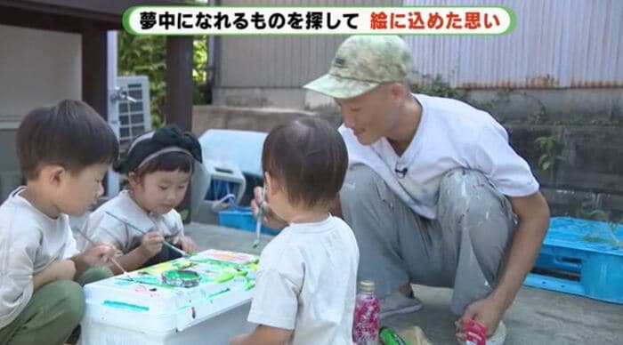 休日のこの日、自宅の庭には家族や近所の子供たちと一緒にお絵描きを楽しむ姿が。