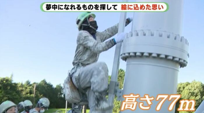 鈴木さんの仕事は、送電線鉄塔の保守点検。この日は、高さ77mある鉄塔の塗装作業だ。安全に気を配りながらも慣れた様子でハシゴを登っていく。