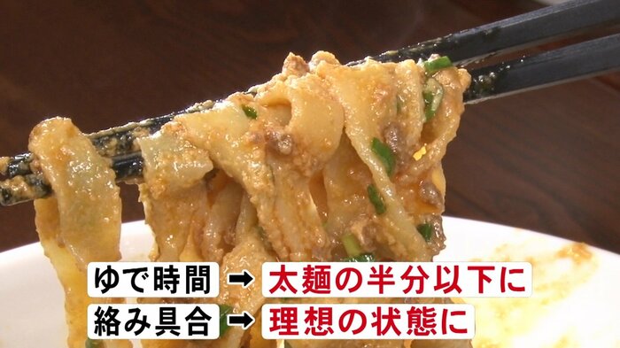 “汁あり担々麺”には細麺を使っているという中村シェフ。なぜ“汁なし”には、平打ち麺を使っているのだろうか。