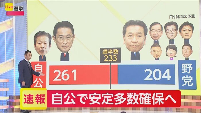 10月31日に投開票が行われた衆議院選挙。衆院選の過半数となる「233」の議席を、与党あるいは自民党単独で確保できるかがポイントとなる。20時時点のFNN議席予測では、自民党が46議席減らし、230議席で単独過半数を割る予測に。