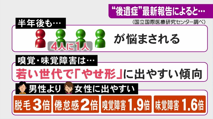 また嗅覚障害や味覚障害は若い世代で、さらに「やせ型」ほど出やすい傾向にあるとされている。男性よりも女性のほうが出やすいことも判明し、脱毛は3倍、倦怠感は2倍だという。