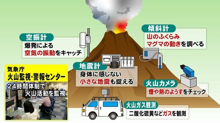 これらを測定して気象庁が分析し、異常が見られた場合は噴火警報や予報を出すが、噴火を事前に予知するのはなかなか難しいのが現状だという。