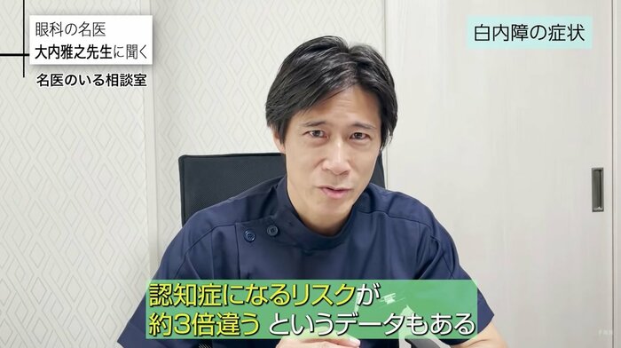 白内障は緊急性のある病気ではありませんが、きちんと治している人とそうでない人では、認知症になるリスクが約3倍違うというデータがあります。