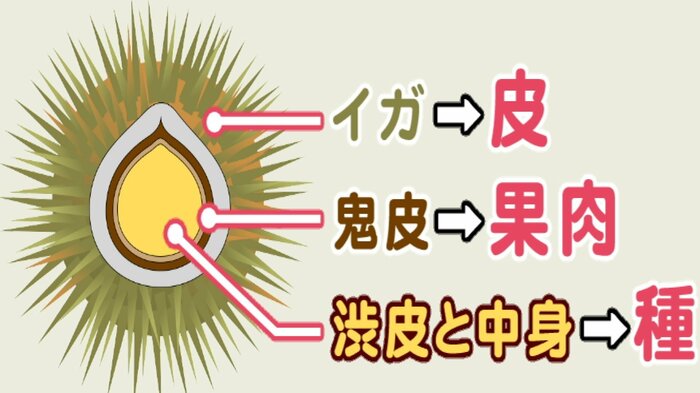 栗の構造は、イガが「皮」で、普段私たちがむいている厚く堅い皮は「鬼皮(おにかわ)」という。皮と思われがちな「鬼皮」が果肉にあたり、食べている部分が渋皮つきの「種」になる。