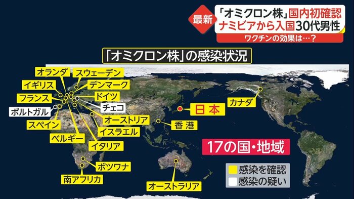 瞬く間に世界へと広がったオミクロン株の感染者は日本を含め17の国と地域(日本・カナダ・香港・オーストリア・スウェーデン・デンマーク・ドイツ・オーストリア・イスラエル・イタリア・ボツワナ・オランダ・イギリス・フランス・スペイン・ベルギー・南アフリカ)に拡大。