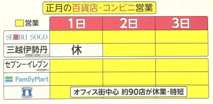 百貨店を見てみますと、西武とそごうは元日から通常営業。三越伊勢丹は元日のみ休みということです。