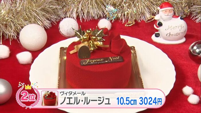 第2位は、真っ赤な表面が特徴のヴィタメール「ノエル・ルージュ」(10.5センチ 3024円)。クリスマスをイメージして赤いチョコレートでコーティングしている。