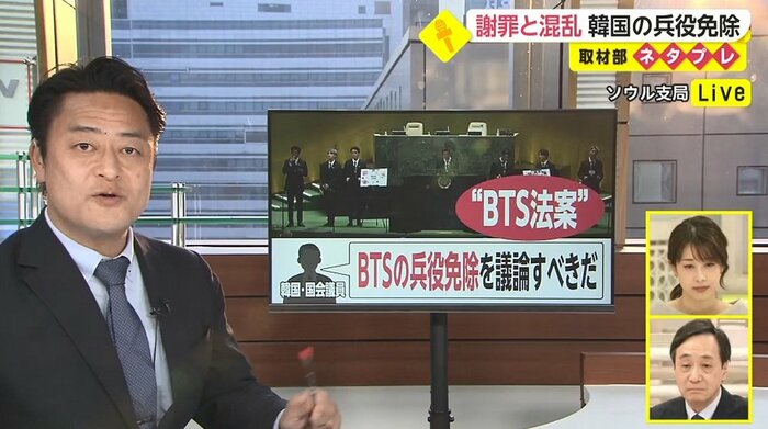 韓国の国会では、25日からBTSのメンバーの兵役を免除の対象にするか審議が始まりました。BTSは、アメリカ三大音楽祭の1つ「アメリカン・ミュージック・アワード」でアジア人アーティストとして初めて大賞を受賞。その人気はまさに世界を席巻しており、経済効果は数千億円に上るとも言われています。また、大統領特使として国連で演説まで行うなど、韓国の国際的な地位を支える存在になっている。