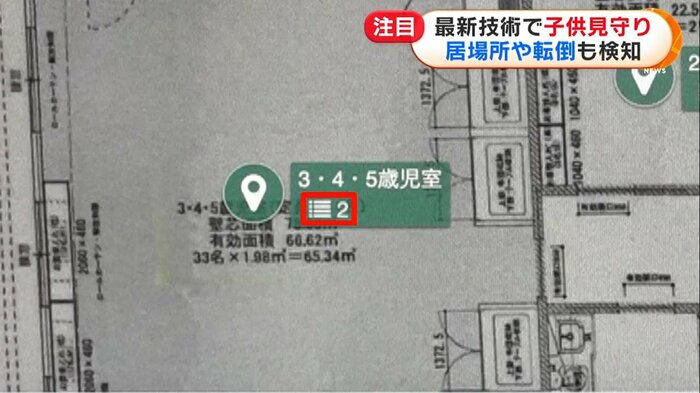 PC画面の平面図には子どもたちが遊んでいる「3・4・5歳児室」という部屋の名称の下に、リストバンドをつけた子が2人いることを示す「2」というも数字も表示されている。