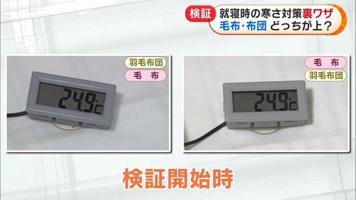 検証開始時の布団の中の温度は、いずれも24.9℃。