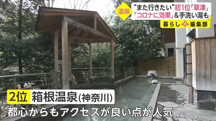 2位は、これまで調査開始から15年連続で頂点に立ち続けてきた神奈川県の「箱根温泉」。交通アクセスが良く、都心からも手軽に行くことができる点が人気の理由だ。