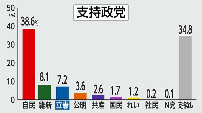 続いて「実行力に期待できる」が25.9%。「首相の人柄が信頼できる」と「自民党中心の内閣だから」はともに15.2%で、「政策がよい」は3.9%にとどまった。