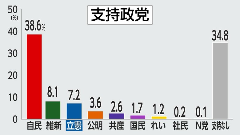 政党別の支持率を見ると、野党の支持率トップは日本維新の会で、立憲民主党は、これに及ばない。維新の後塵を拝するのは、11月に続いて2回目だ。